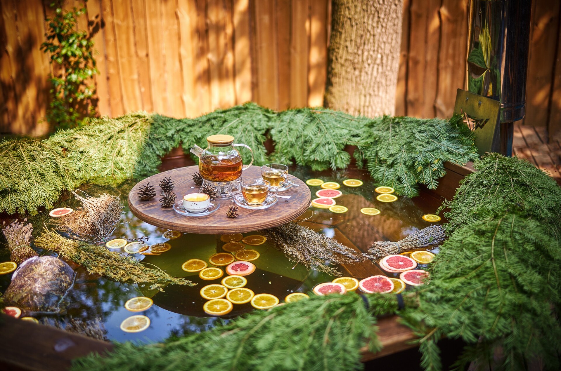 После растопки борта чана застилают лапником, 12 пихтовыми вениками, а в воду добавляют дольки апельсинов и грейпфрутов.